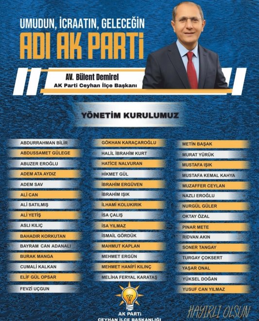 AK Parti Ceyhan İlçe Başkanı Avukat Bülent Demirel yönetimini belirledi.