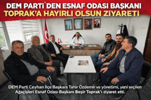 DEM Parti Ceyhan İlçe Başkanı Tahir Özdemir ve ilçe yönetimi, Ağaçişleri Esnaf Odası Başkanlığına yeni seçilen Beşir Toprak’ı ziyaret etti.